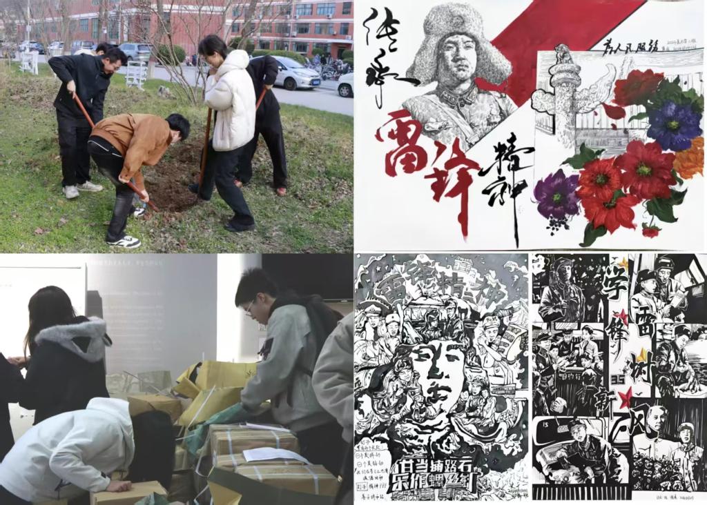 活动中,美院学子积极投身校园志愿服务,在新学期教材发放、植树节义务植树等活动中主动担当作为,帮扶同学、绿化校园,以实际行动践行奉献精神。同时,大家充分发挥动画设计、环境艺术等专业特长,以画笔为媒,围绕雷锋精神创作主题海报、绘画作品,生动展现榜样事迹与新时代雷锋精神内涵,实现思政教育与专业实践深度融合。