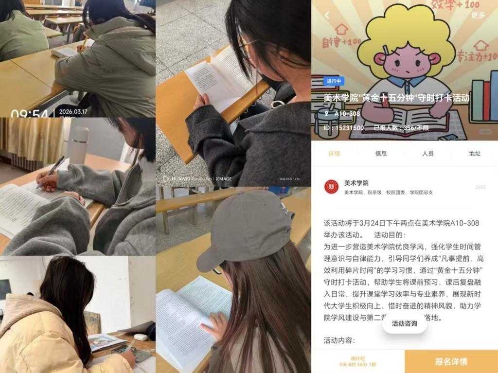 接下来,学院会持续巩固这次活动的成效,把活动中养成的良好学习习惯融入学生的日常学习生活,以学风建设为基础优化育人措施,让“黄金十五分钟”成为学生成长路上的坚实阶梯,为培养高素质艺术人才打好学风基础。
